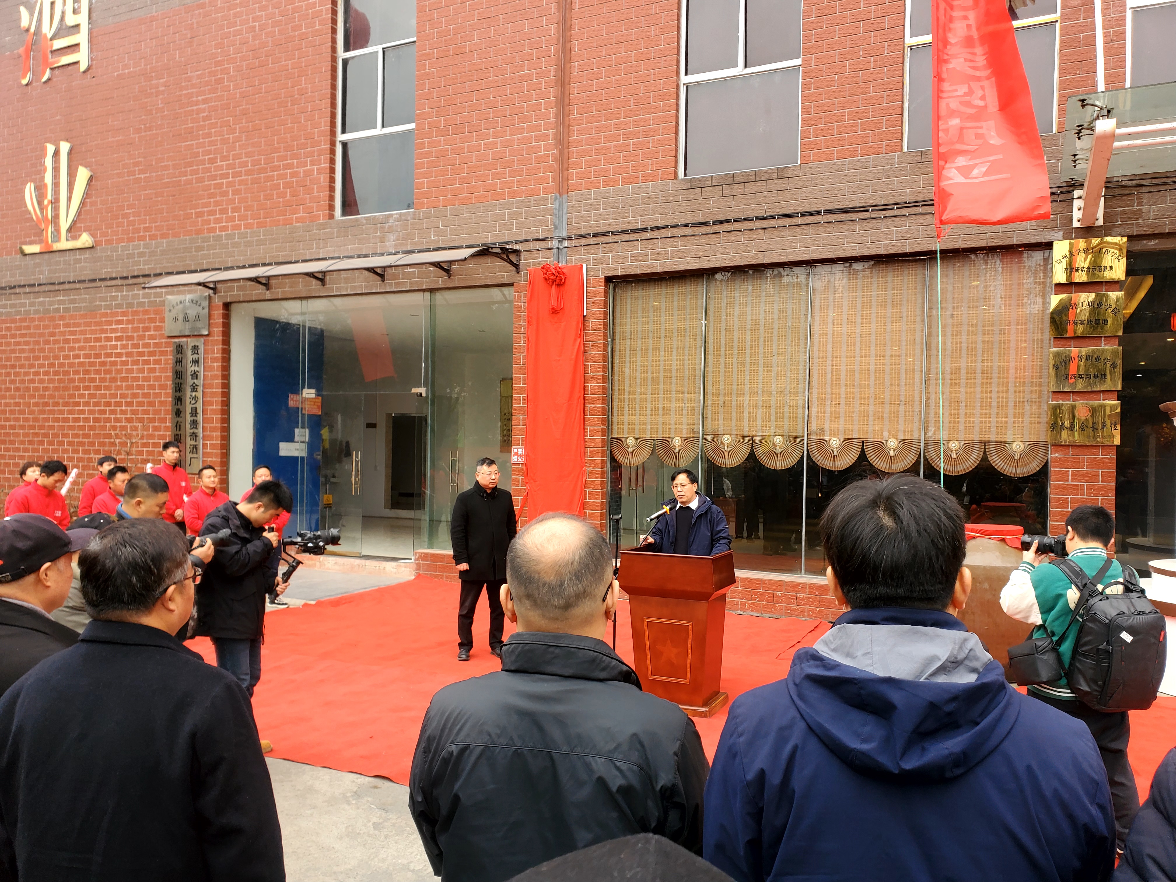 党委书记卫红伟、贵奇酒厂董事长尤永松、金沙县酒业协会会长李文俊等领导现场发言,相关各方代表共同进行了河南工业大学贵奇酒厂产学研基地的揭牌仪式。