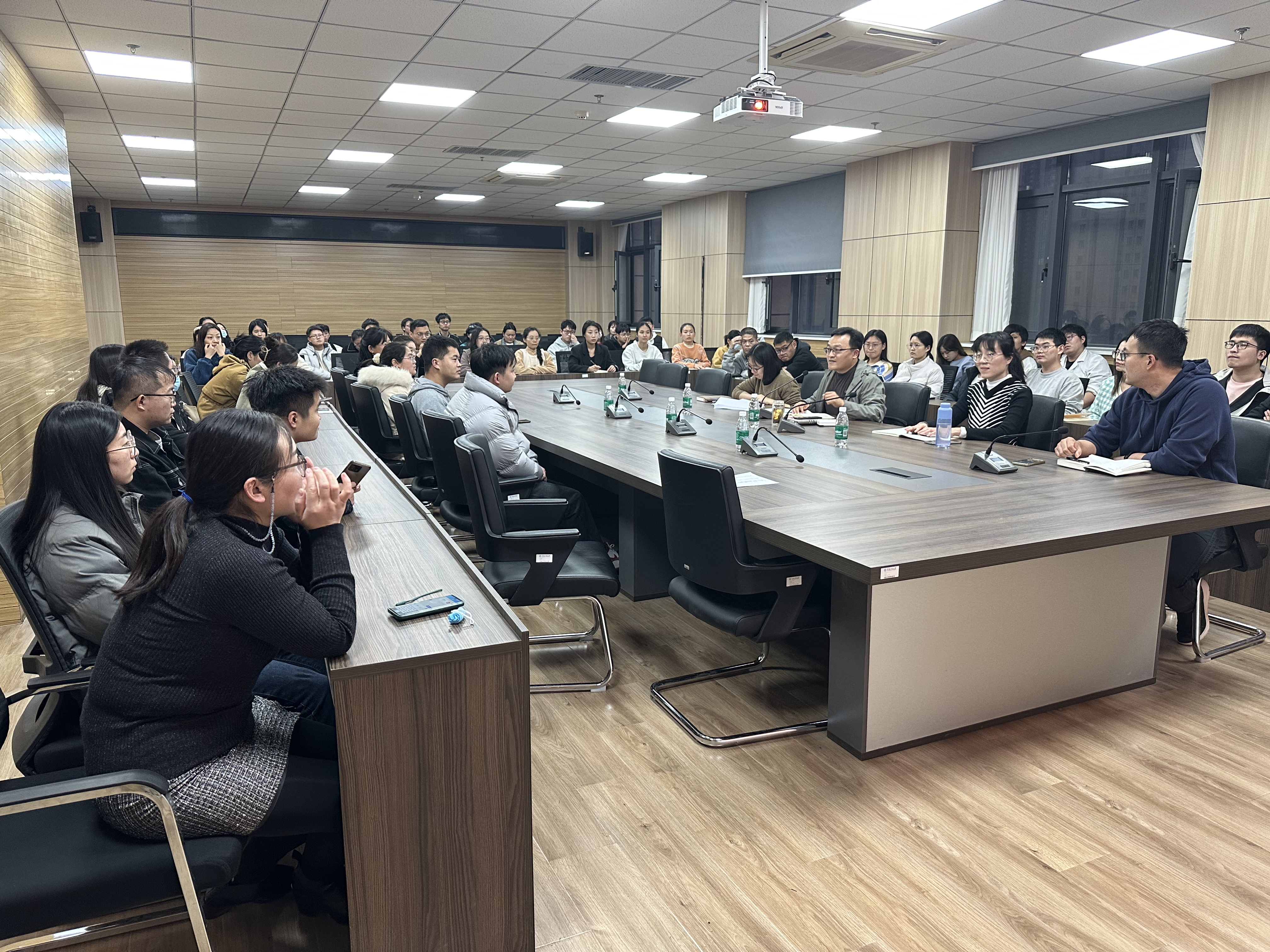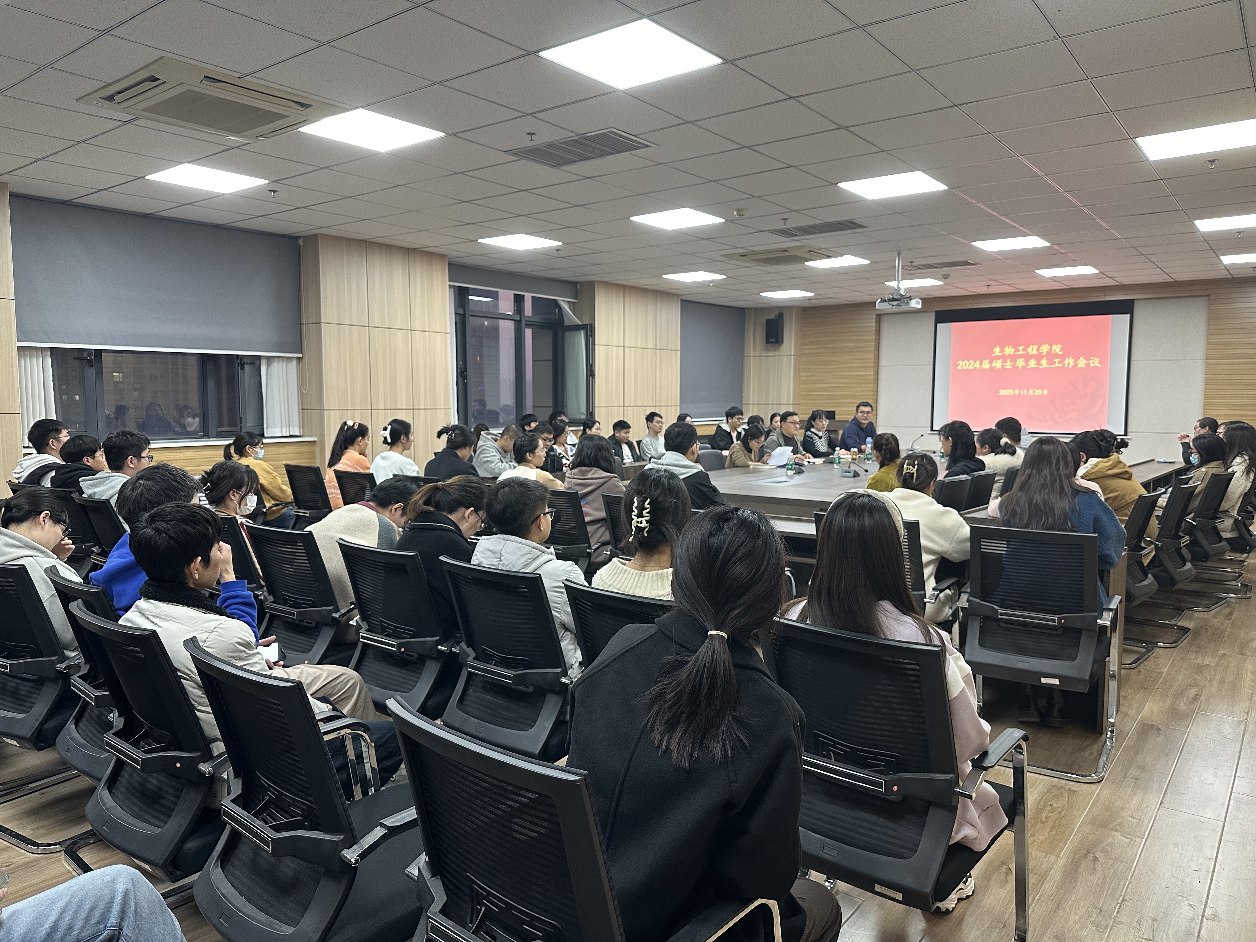 在基础实验实训中心1313会议室召开2024届硕士毕业生就业工作推进会。学院党委副书记余汉华、学工办主任岳媛媛、研究生辅导员张鑫荟、唐天悦以及2024届全体硕士毕业生参加了会议。会议由余汉华副书记主持。