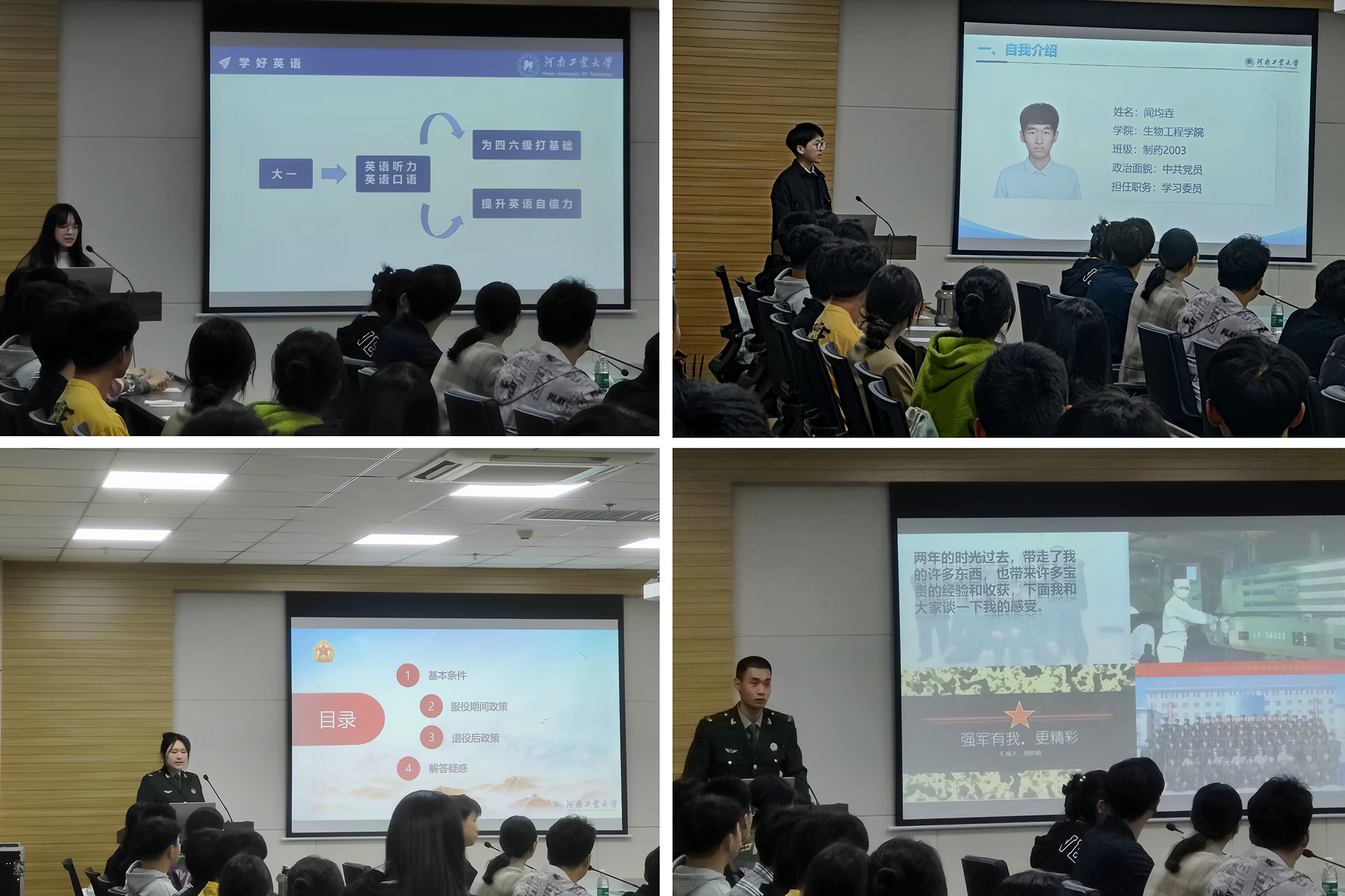 生物技术2103班乔彤彤以“我可对镜贴花黄 亦可铁甲披寒光”为题,详细介绍了参军流程和参军政策,通过分享自己服役期间的故事和体验,鼓励同学们积极响应国家和军队号召,勇于追梦,敢于圆梦,切实把参军入伍当作锻炼自己、提升自己的大舞台。