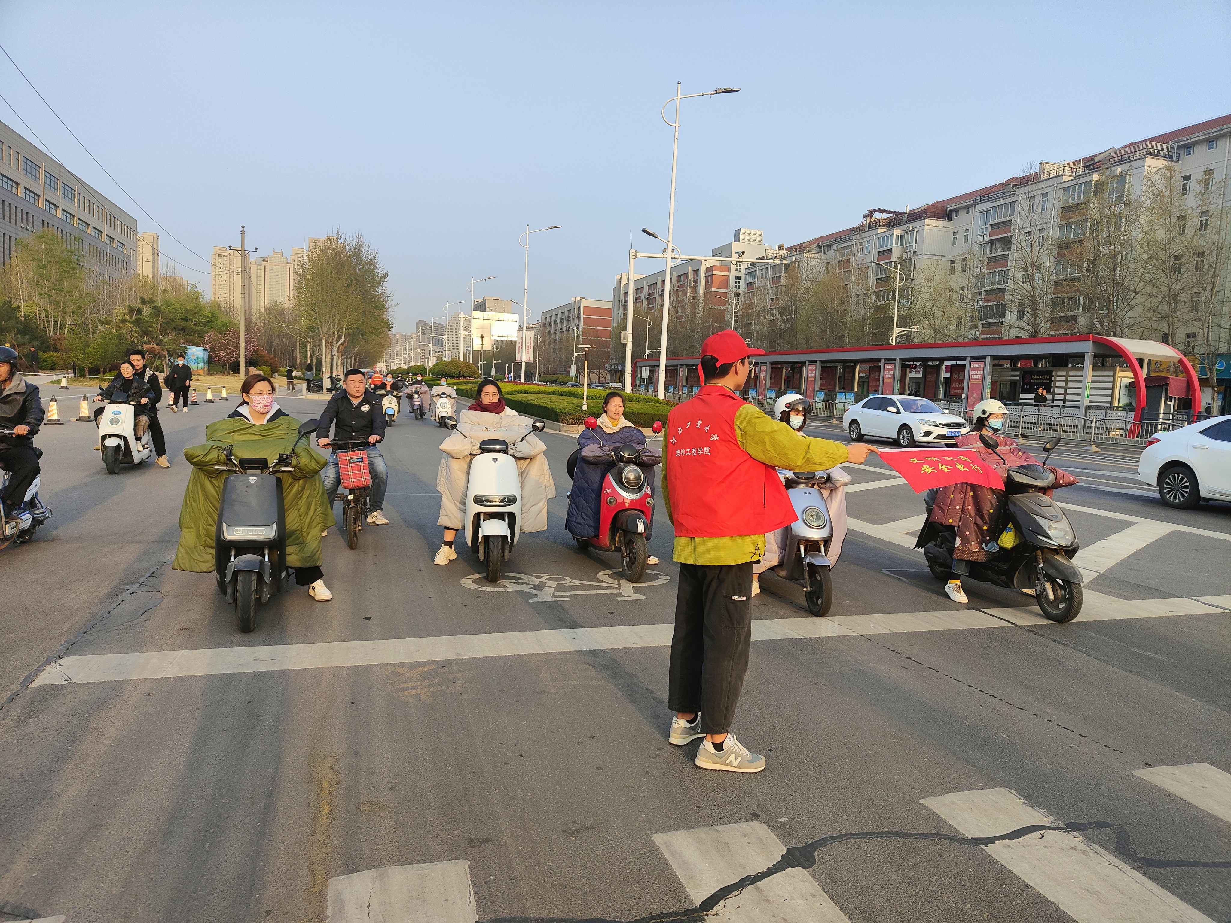 的师生志愿者们提前到岗,志愿者们穿戴红马甲和帽子,手持交通劝导旗,在各个路口对闯红灯、不走斑马线、逆向行驶等不文明行为进行劝导。对身体活动不便的老人、放学回家的小学学生,志愿者们热情地提供帮助,确保他们安全通过。他们用热情和微笑倡导着文明出行,传递着“文明交通,从我做起”的正能量,志愿者们坚守岗位,规范执勤,以高度的责任感、昂扬的精神面貌展现了学院师生的良好形象,志愿者们温馨的话语、热情的服务受到了过往行人的纷纷点赞。