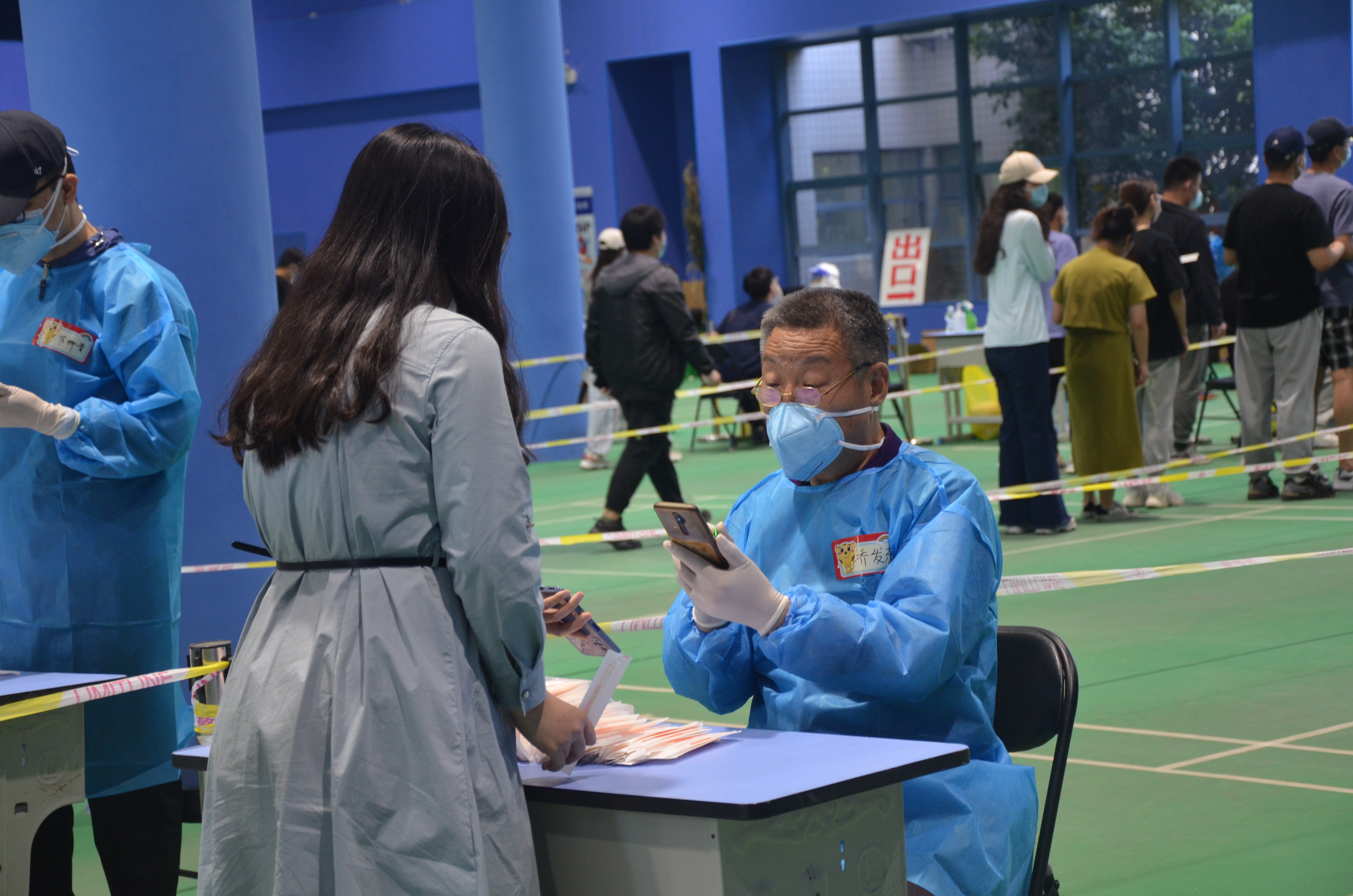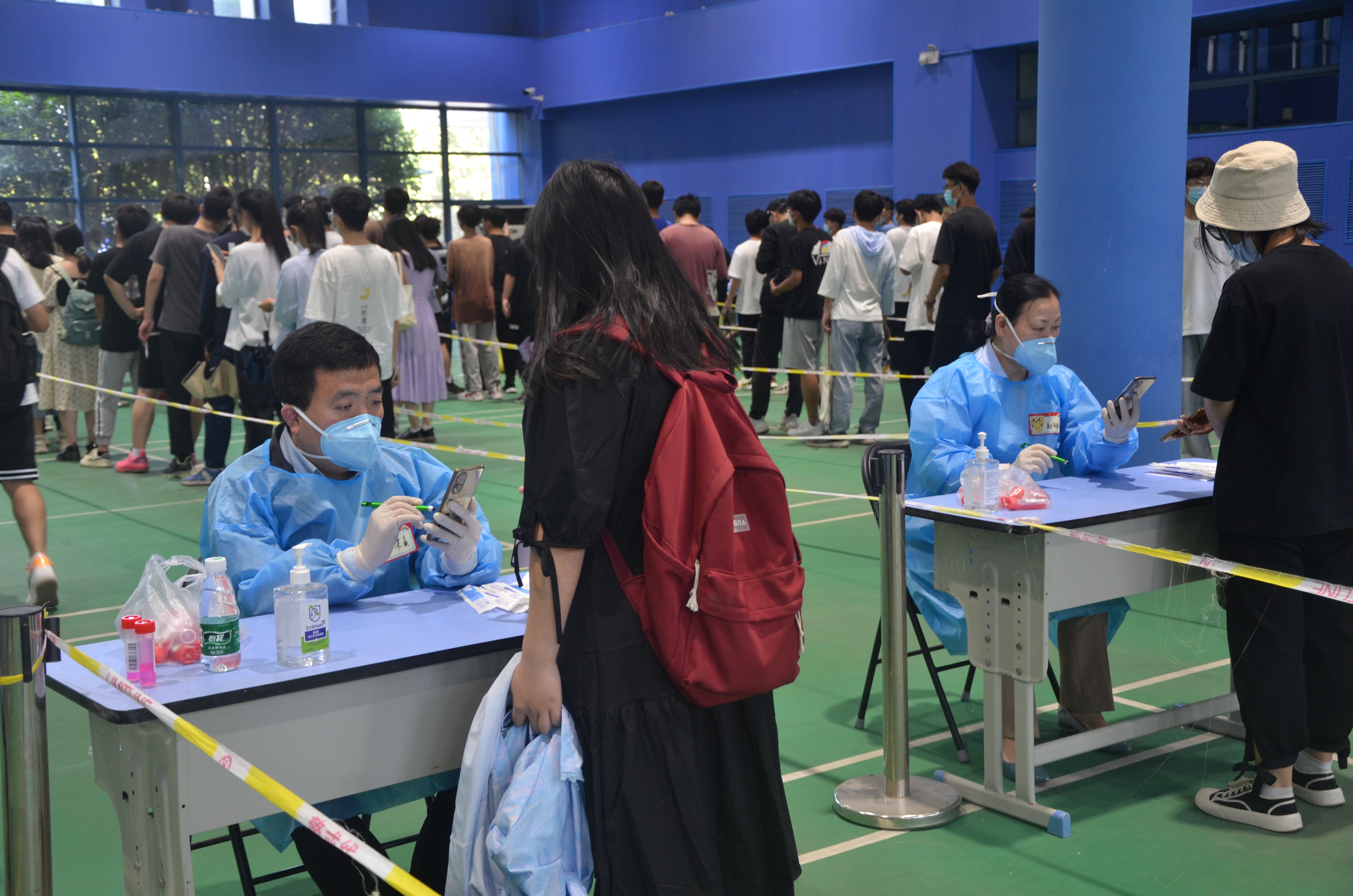 下午1时,学院党员志愿者团队做好充分准备,在学院领导带领下准时抵达核酸检测现场,接受任务,奔赴岗位,部分志愿队员刚刚下课午饭都顾不上吃就投入紧张工作,迎接每一位接受检测的师生员工到来。整个检测过程,学院李继周、胡元森、余汉华等班子成员全程在现场指挥调度;身穿红色志愿者马甲的辅助检测老师,认真维持现场秩序,做好现场指引,提醒保持间距;身穿蓝色防护服的志愿者老师,严谨细致、有条不紊、准确高效地对每一个检测者进行扫码登记,对无码或无手机的师生进行耐心的讲解,帮助他们注册核酸登记码或者扫身份证进行检测登记等,确保全校35000多名师生整个检测过程不漏一人,直到完成最后一例检测。通过大家的齐心协力工作,确保了本次全员核酸检任务高效、有序、顺利地圆满完成。