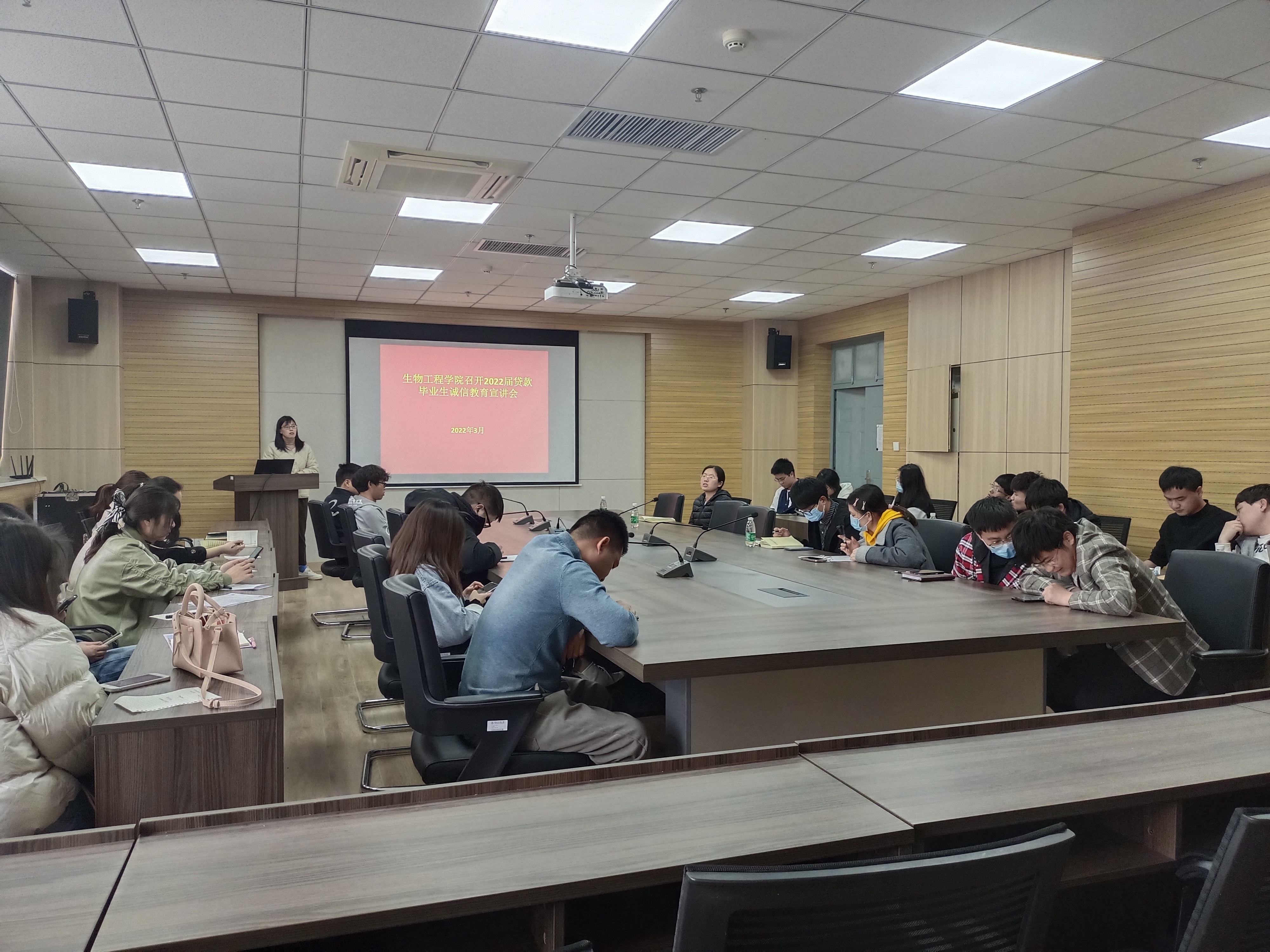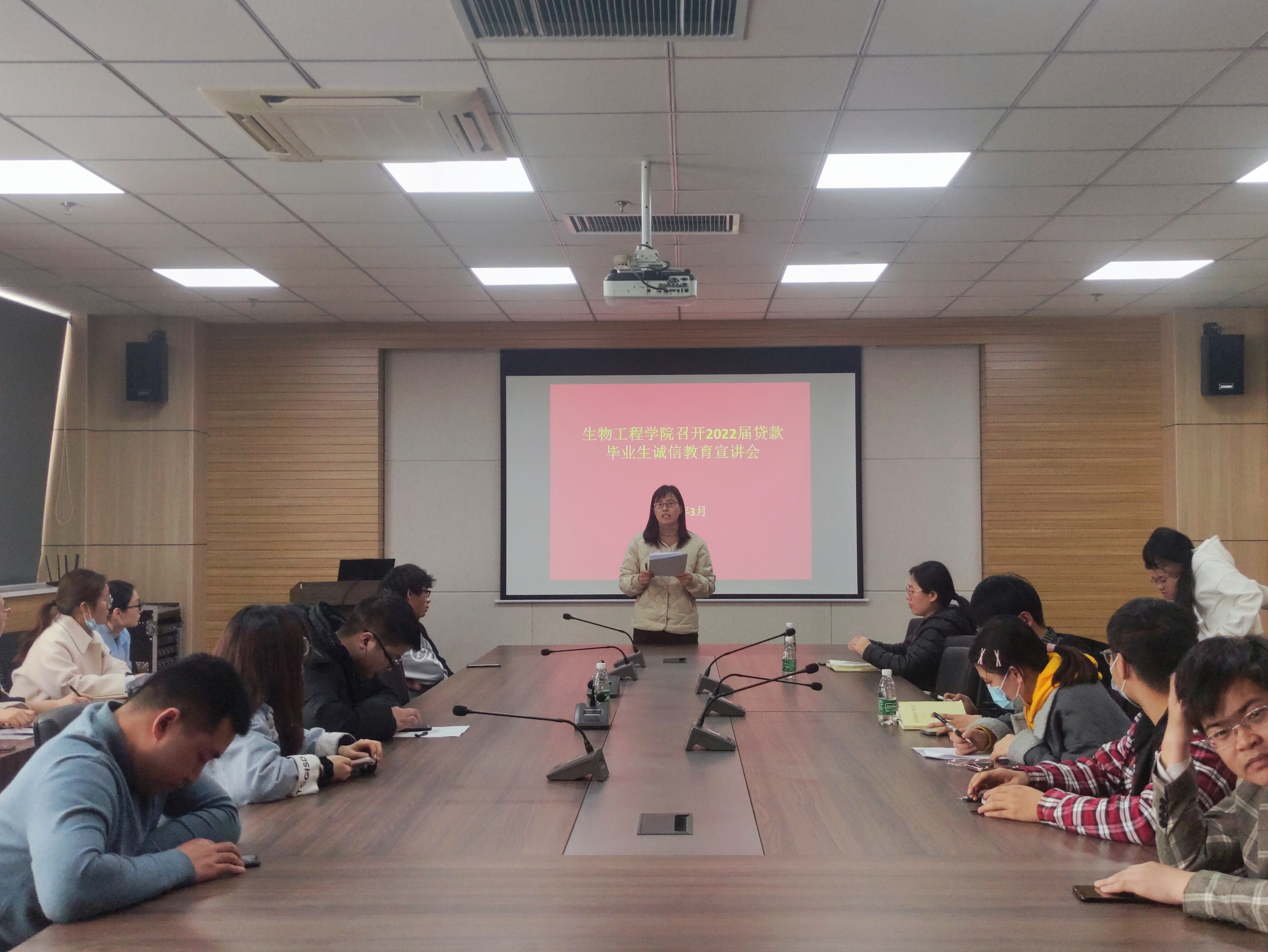 在1313会议室召开2022届贷款毕业生诚信教育宣讲会。院学工办主任岳媛媛、辅导员李亚楠、资助助理及2022届贷款毕业生参加了此次会议。