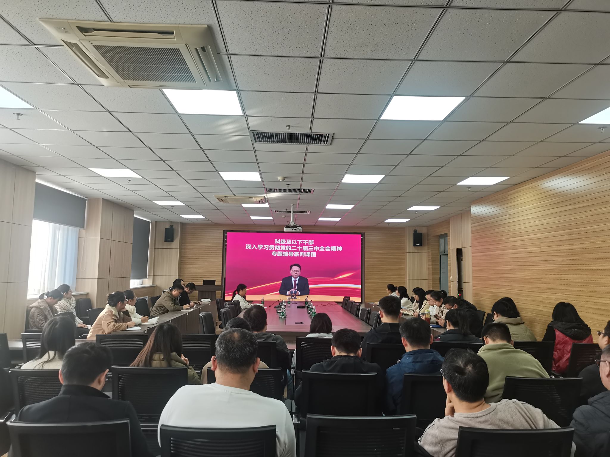 在惟德楼1313会议室组织开展科级及以下干部、党员学习贯彻党的二十届三中全会精神专题培训。学院科级及以下干部、党员参加培训会。