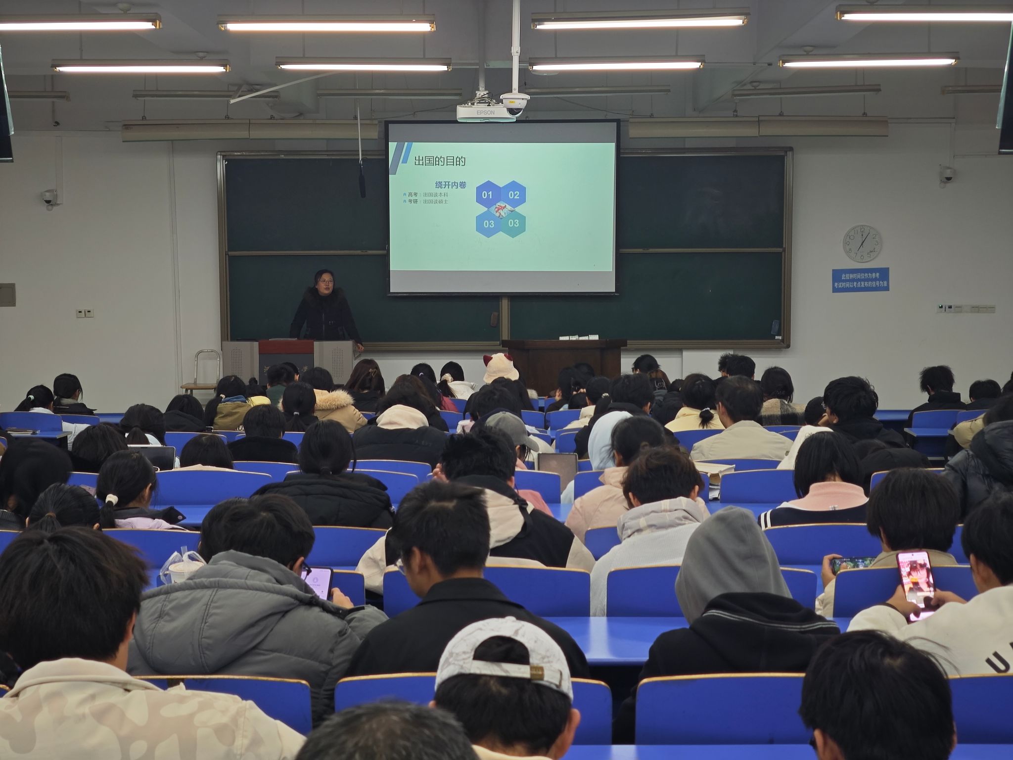 先后在4号楼4121教室和4120教室举办了两场出国留学宣讲活动。宣讲会邀请国际教育学院副院长赵红月进行宣讲,2023级和2024级本科生参加会议。