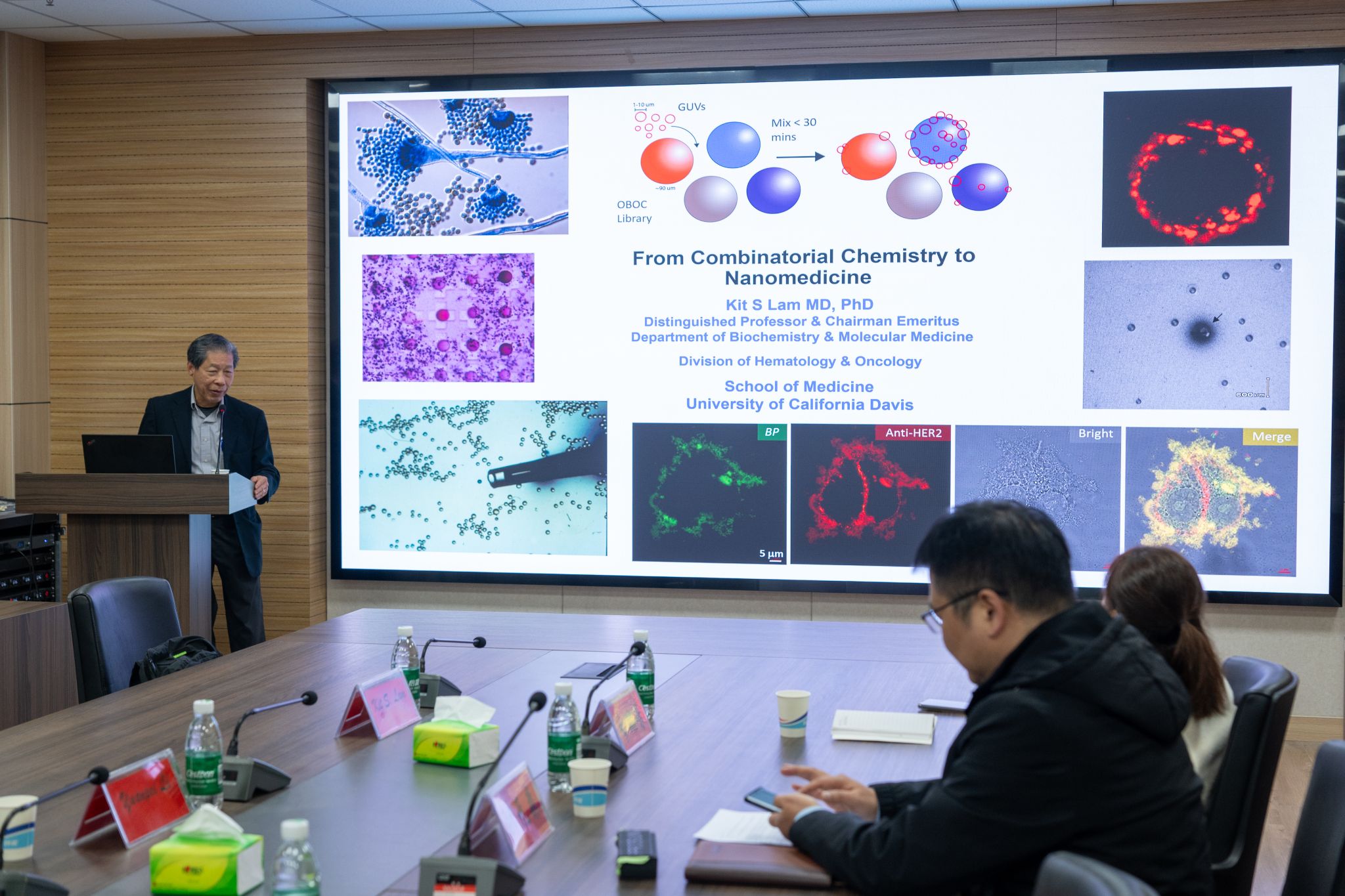 在交流会上,Kit S. Lam博士首先作了题为“From combinatorial chemistry to nanomedicine”的学术报告。Lam博士回顾了其在组合化学(Combinatorial Chemistry)领域的开创性贡献,特别是他率先提出的“one-bead one-compound(OBOC)”概念及其在基础研究、药物发现和材料开发中的广泛应用。Lam博士分享了近年来OBOC技术应用在纳米医学领域的研究成果,包括针对肿瘤精准给药的多种纳米平台开发及利用体内Click Chemistry实现高特异性纳米递送的新进展。他的研究为精准医学和创新药物研发提供了重要的理论和技术支持。