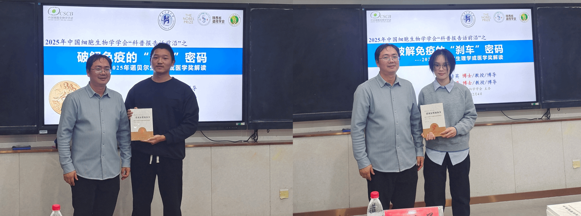 2025年12月4日晚,生物工程学院特邀西北农林科技大学动物科技学院蓝贤勇教授,为饲料工程专业本科生做题为《破解免疫的“刹车”密码—2025年诺贝尔生理学或医学奖解读》的科普报告。本次报告由动物科学系主任乔汉桢副教授主持。2024、2025级的饲料工程专业本科生及系青年骨干教师张雪蕾、张封东博士共同参与了报告,师生齐聚一堂,共同聆听前沿科学解读,彰显了我系对本科生科研启蒙与创新能力培养的持续重视。