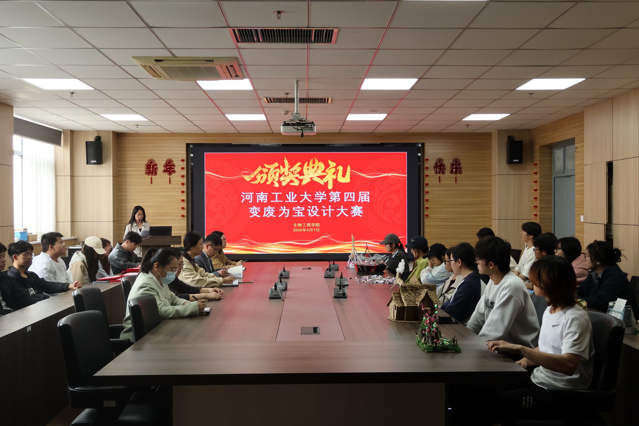 颁奖活动现场,来自设计艺术学院的获奖学生代表王燕茹分享了她的创作思路和收获感受。蔡永平代表学院对获奖同学表示祝贺,希望大家坚守绿色理念,让创意成为成长的翅膀、让环保成为自觉的习惯、让奉献成为青春的底色,将大赛中收获的责任与热情,转化为服务他人、服务集体的实际行动,在平凡中坚守,在奉献中成长,让雷锋精神在新时代校园焕发新的光芒。与会领导老师为获奖团队颁发了荣誉证书及奖品。