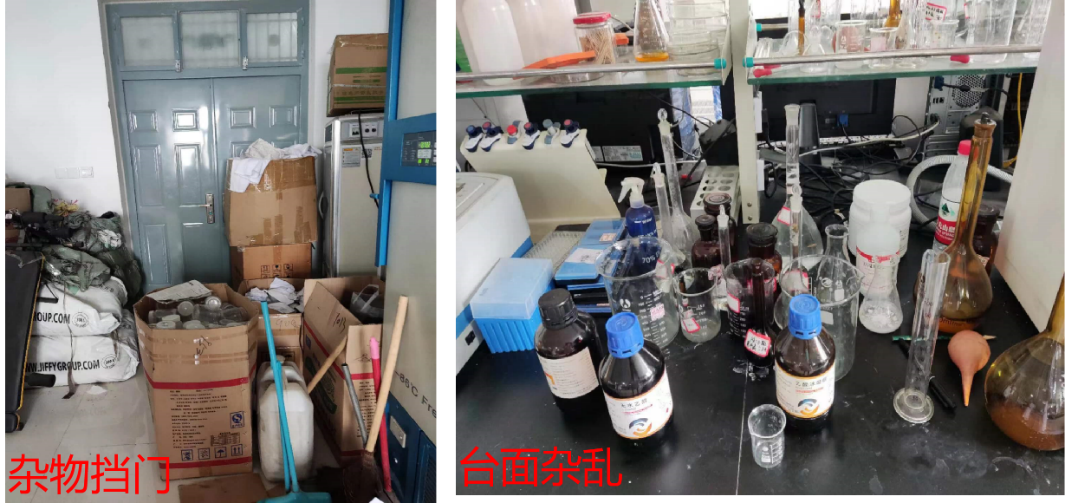 实验台杂乱、纸箱堆积、杂物堵门 |