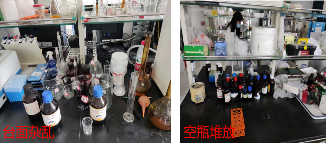 实验台面杂乱、无用泡沫箱未及时清理 |