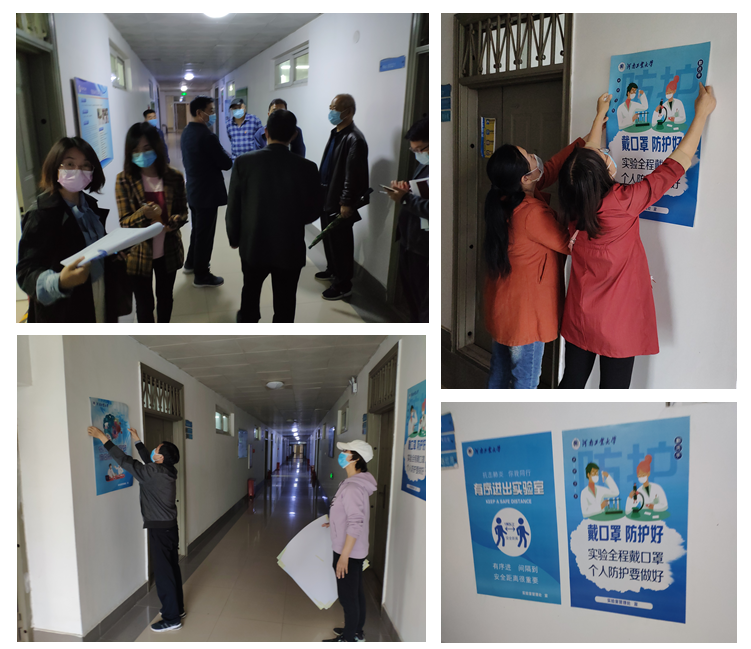 实验中心对学院第一批拟开放使用的研究生实验室进行了集中消毒,并为实验室配发了免洗消毒液、医用外科口罩及一次性PE手套等防疫物资,要求各实验室负责人做好出入人员登记与消毒记录并提供了登记表格。同时,在9号楼生物学院各楼层楼梯入口处及实验室内张贴了防疫宣传海报标语,提醒返校师生最好防护,规范实验室操作使用,确保生物实验安全性。5月9日下午,实验室管理处、保卫处等部门联合对生物学院实验室复课前的准备工作进行了检查,对实验室网格化管理办法、应急预案等材料提出了改进意见,对实验室安全工作提出了肯定和建议。下一步实验中心将根据学校及学院要求,继续做好服务工作,确保实验室逐步安全稳定的恢复运行。
