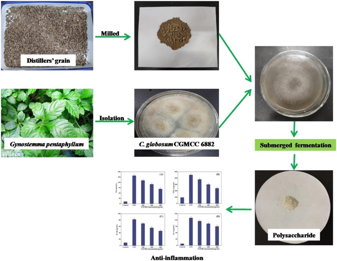 王子朝老师题为“Characterization and anti-inflammation of a polysaccharide produced by Chaetomium globosum CGMCC 6882 on LPS-induced RAW 264.7 cells”的研究论文。该研究采用药食两用植物绞股蓝内生真菌Chaetomium globosum CGMCC 6882,成功发酵制备了胞外多糖CGP-BG。化学分析表明,CGP-BG中含有3.49 ± 0.51%的蛋白质,该多糖以4.11:7.34:13.31:20.99:1.07:0.91:4.75:0.36的摩尔比,由鼠李糖、阿拉伯糖、半乳糖、葡萄糖、木糖、甘露糖、半乳糖醛酸和葡萄糖醛酸组成。体外实验表明,CGP-BG对羟基自由基、DPPH自由基、超氧阴离子和ABTS自由基的清除活性呈剂量依赖性。同时,CGP-BG还能显著抑制脂多糖(LPS)诱导的RAW 264.7细胞中NO和促炎症因子(TNF-α、IL-6和IL-1β)的产生。此外,CGP-BG通过增强超氧化物歧化酶、谷胱甘肽过氧化物酶、抗氧化能力,减少丙二醛活性,显著改善LPS诱导处理的巨噬细胞的氧化应激状态。王子朝为论文第一作者,17级本科生刘晓莹为论文第二作者,江南大学禁漫天堂
