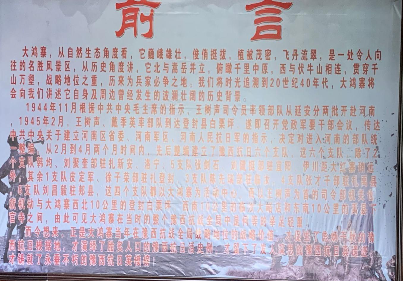 接着我们被一幅记录着激情澎湃的革命发展史的图画所吸引,1945年3月,河南军区第四支队司令员张才千,奉命率部挺进禹北山区浅井、扒村一带,发动群众,开展抗日武装斗争,在禹、密交界处之荟萃山成立了豫西军区第四分区、豫西区党委第四地委、豫西行政公署第四专员公署,1945年7月,禹县人民抗日武装部成立,指挥长李迎希、政委叶世政、参谋长邢亮、政治部主任莱澄清。指挥部下设三个抗日独立团,同时,还建立了禹县抗日大队、禹县抗日游击大队、禹县民兵独立大队。至1945年10月,全县人民抗日武装发展到2400多人,配合一、四支队先后组织了密南战役、禹西战役和郏北战役,消灭日伪军2000多人。在血腥残酷的战争中,老一辈革命家无私奉献,舍己为国的革命大无畏精神使我们动容,他们是时代的楷模,谱写了无数的革命序章,是革命的英雄!
